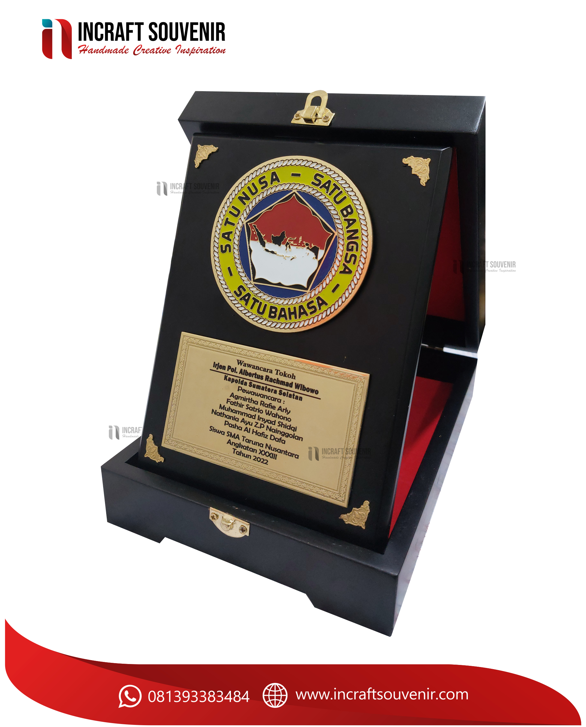 Plakat kayu merupakan produk plakat yang eksklusif dan elegan. Plakat kayu dengan sentuhan kombinasi plat kuningan menjadikan plakat kayu banyak sekali diminati baik instansi pemerintah, BUMN, Universitas dan juga perusahaan – perusahaan swasta. Produk plakat kayu ini terkenal dengan nilai kemewahanya dengan kombinasi kuningan