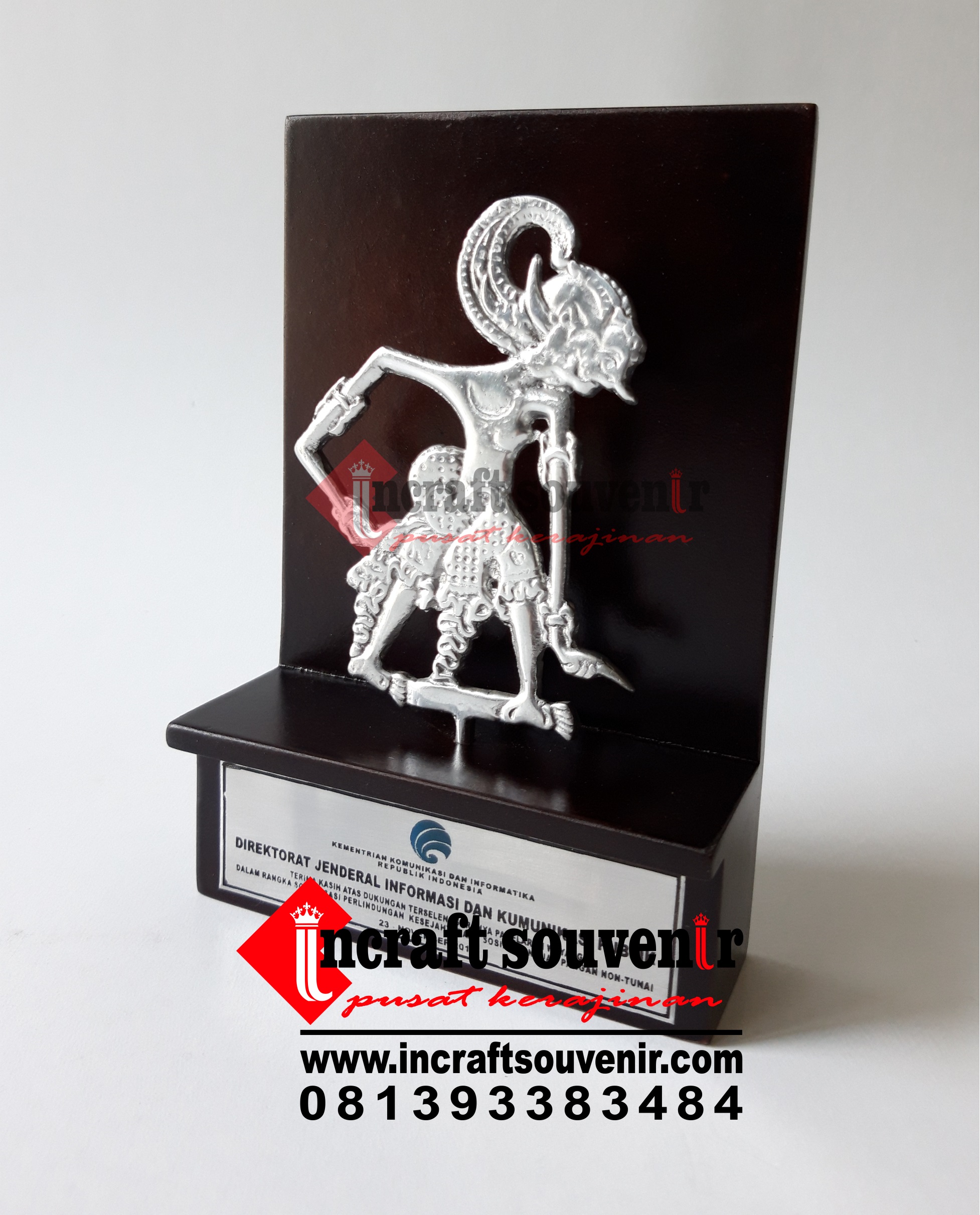 Plakat Wayang merupakan produk plakat yang eksklusif dan elegan. Plakat Wayang dengan kombinasi variasi logam menjadikan Plakat Wayang banyak sekali diminati baik instansi pemerintah, BUMN, Universitas dan juga perusahaan – perusahaan swasta. Produk Plakat Wayang ini terkenal dengan nilai kemewahanya dengan kombinasi dan dilengkapi dengan kotak bludru / batik menambah nilai eksklusufitas Plakat Wayang ini. Harga Plakat Wayang sendiri bervariasi tergantung dari kesulitan juga ukuranya.