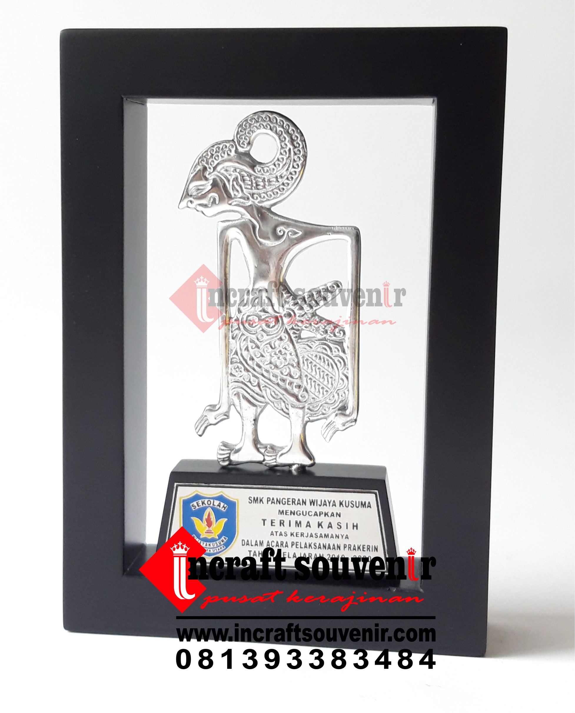 Plakat Wayang merupakan produk plakat yang eksklusif dan elegan. Plakat Wayang dengan kombinasi variasi logam menjadikan Plakat Wayang banyak sekali diminati baik instansi pemerintah, BUMN, Universitas dan juga perusahaan – perusahaan swasta. Produk Plakat Wayang ini terkenal dengan nilai kemewahanya dengan kombinasi dan dilengkapi dengan kotak bludru / batik menambah nilai eksklusufitas Plakat Wayang ini. Harga Plakat Wayang sendiri bervariasi tergantung dari kesulitan juga ukuranya.
