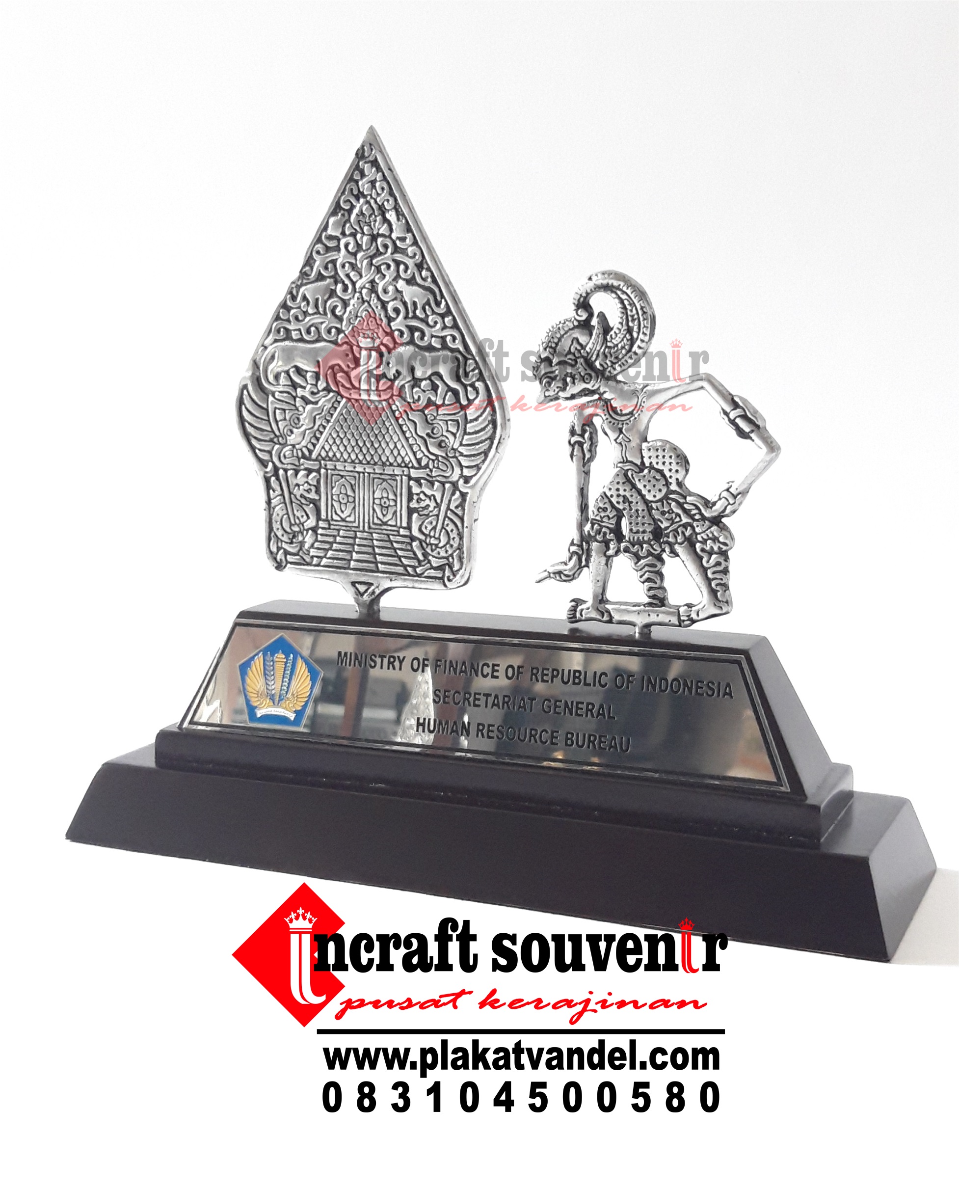 Plakat Wayang merupakan produk plakat yang eksklusif dan elegan. Plakat Wayang dengan kombinasi variasi logam menjadikan Plakat Wayang banyak sekali diminati baik instansi pemerintah, BUMN, Universitas dan juga perusahaan – perusahaan swasta. Produk Plakat Wayang ini terkenal dengan nilai kemewahanya dengan kombinasi dan dilengkapi dengan kotak bludru / batik menambah nilai eksklusufitas Plakat Wayang ini. Harga Plakat Wayang sendiri bervariasi tergantung dari kesulitan juga ukuranya.