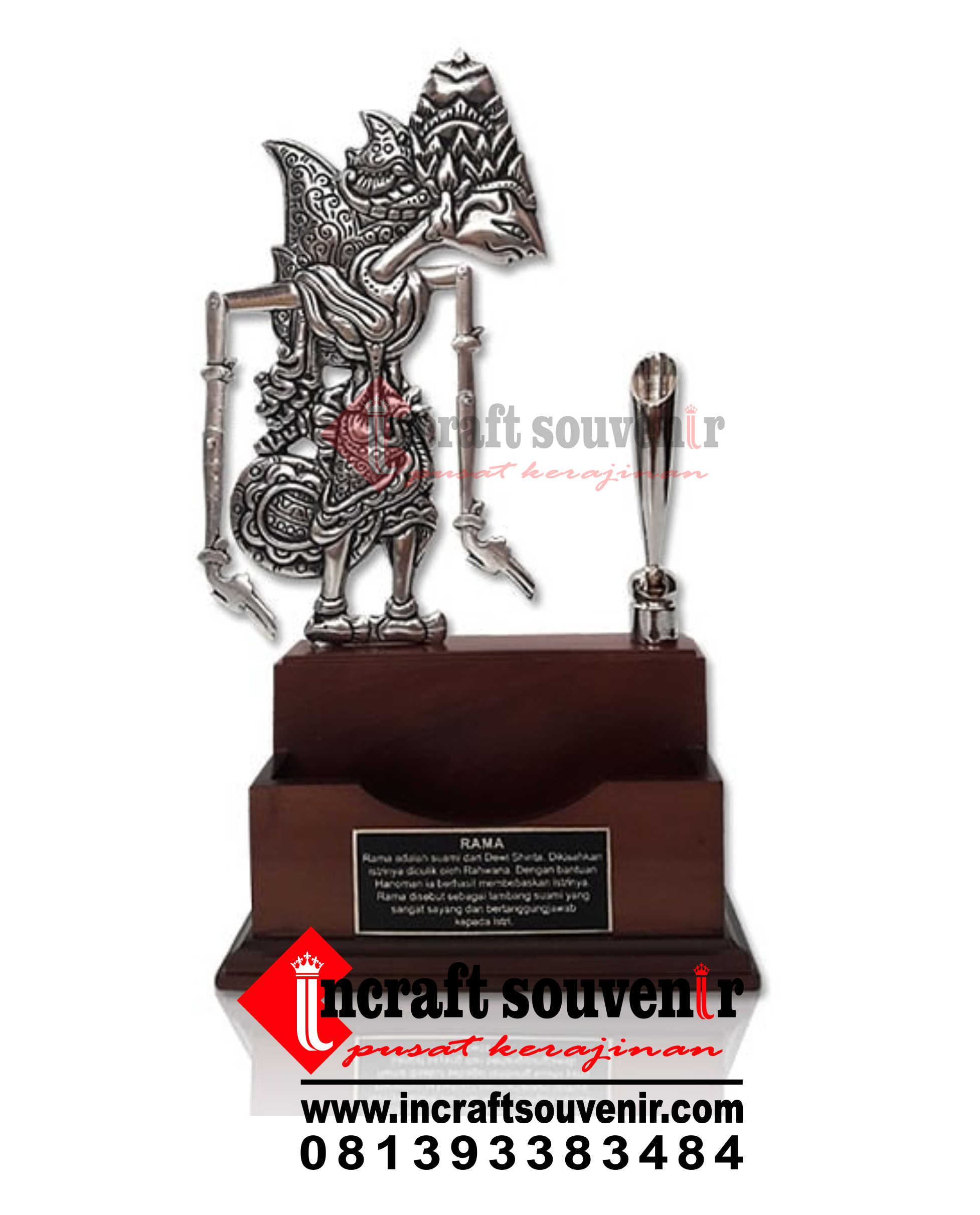 Plakat Wayang merupakan produk plakat yang eksklusif dan elegan. Plakat Wayang dengan kombinasi variasi logam menjadikan Plakat Wayang banyak sekali diminati baik instansi pemerintah, BUMN, Universitas dan juga perusahaan – perusahaan swasta. Produk Plakat Wayang ini terkenal dengan nilai kemewahanya dengan kombinasi dan dilengkapi dengan kotak bludru / batik menambah nilai eksklusufitas Plakat Wayang ini. Harga Plakat Wayang sendiri bervariasi tergantung dari kesulitan juga ukuranya.
