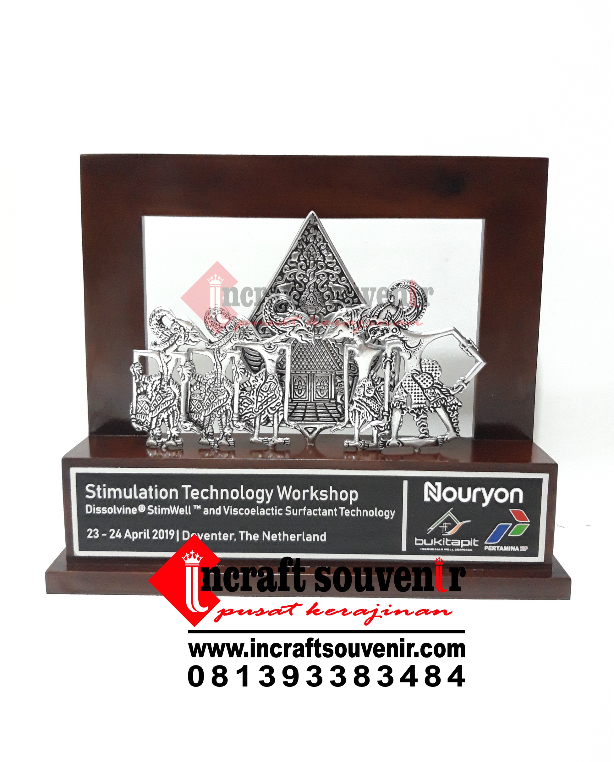 Plakat Wayang merupakan produk plakat yang eksklusif dan elegan. Plakat Wayang dengan kombinasi variasi logam menjadikan Plakat Wayang banyak sekali diminati baik instansi pemerintah, BUMN, Universitas dan juga perusahaan – perusahaan swasta. Produk Plakat Wayang ini terkenal dengan nilai kemewahanya dengan kombinasi dan dilengkapi dengan kotak bludru / batik menambah nilai eksklusufitas Plakat Wayang ini. Harga Plakat Wayang sendiri bervariasi tergantung dari kesulitan juga ukuranya.